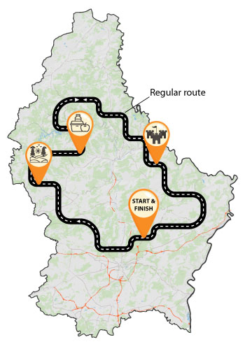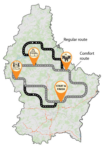 Nous empruntons deux itinéraires différents (classique et confort) et roulons ensemble dans deux directions différentes pour découvrir la campagne luxembourgeoise. Les points forts sont l’Ösling et la Moselle.