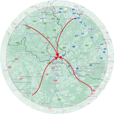 | Certains de nos clubs voisins prévoient un rallye au Luxembourg, et les clubs des Pays-Bas et de France sont déjà en train de planifier. Nous envisageons un rayon de 150 kilomètres autour du Parc Hotel Alvisse, soit des points de départ tels que Maastricht (NL), Namur ou Charleroi (B), Reims ou Strasbourg (FR), voire Cologne, Bonn ou Kaiserslautern. De plus amples informations seront communiquées ultérieurement, car les différents clubs ont encore besoin d’un peu de temps pour se préparer. | ![]() |